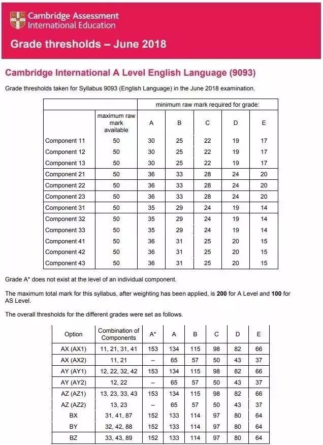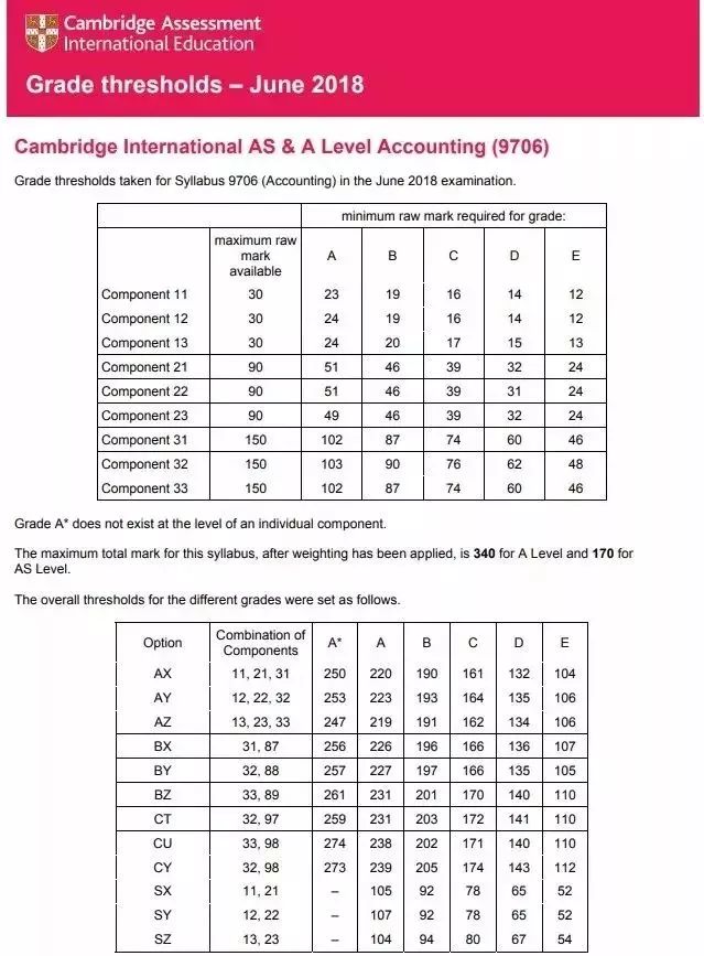 A-Level 分数线需要将2018年5、6月的A2考试,与2017年5、6月的AS考试或是2017年10、11月AS考试合并后计算总成绩。CAIE分数线表格给出的是某一考试系列中,CAIE打分的每一份paper或component的最低分数线。表格中也显示了每个option的最低分数线。一个option是获得认可的papers或components组合到一起,构成整个证书。