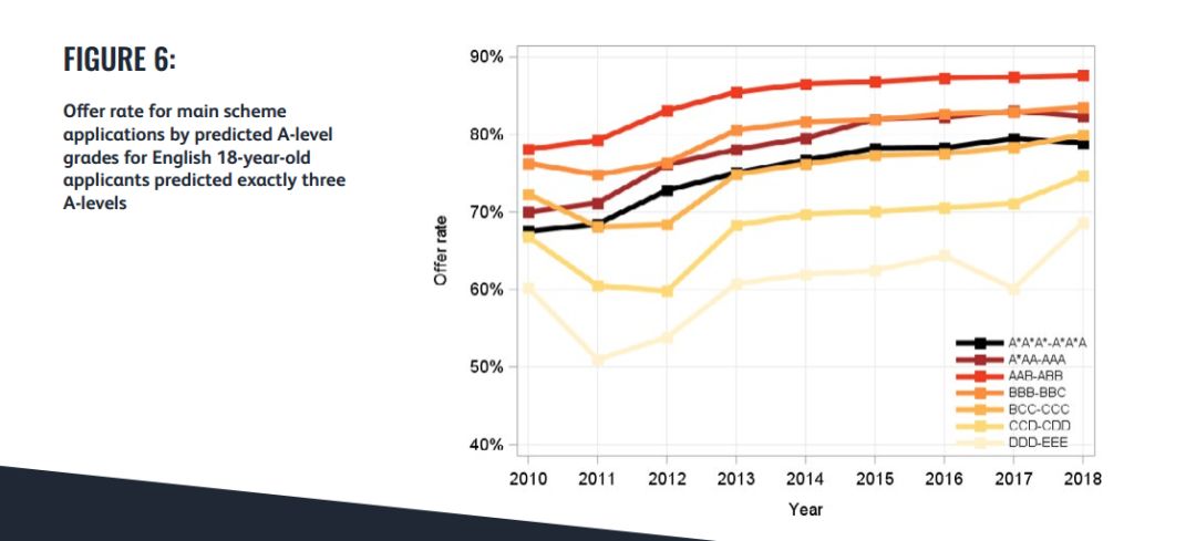 成绩A*A*A及以上基本不变,稍低的ABB-A*AA录取率有所下滑。