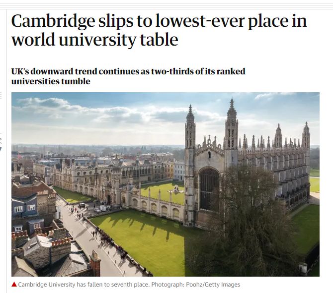 注:下文翻译自卫报报道《Cambridge slips to lowest-ever place in world university table》