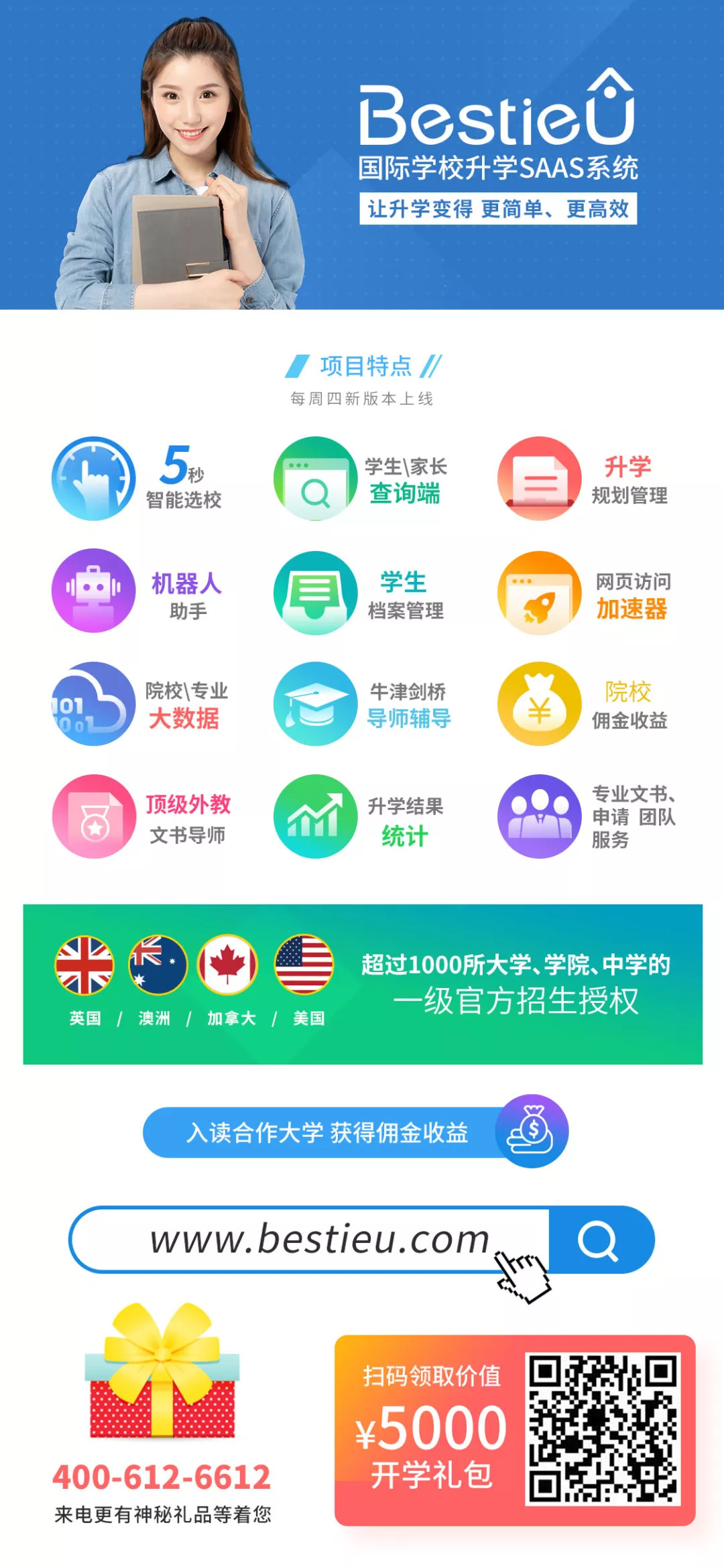 Bestie U国际学校智能升学SAAS系统日前已经正式推出,如果你是国际学校的海外升学指导老师,这里有一个免费试用的机会,赶紧戳“阅读原文”报名!更有一次免费的牛剑培训等着你!