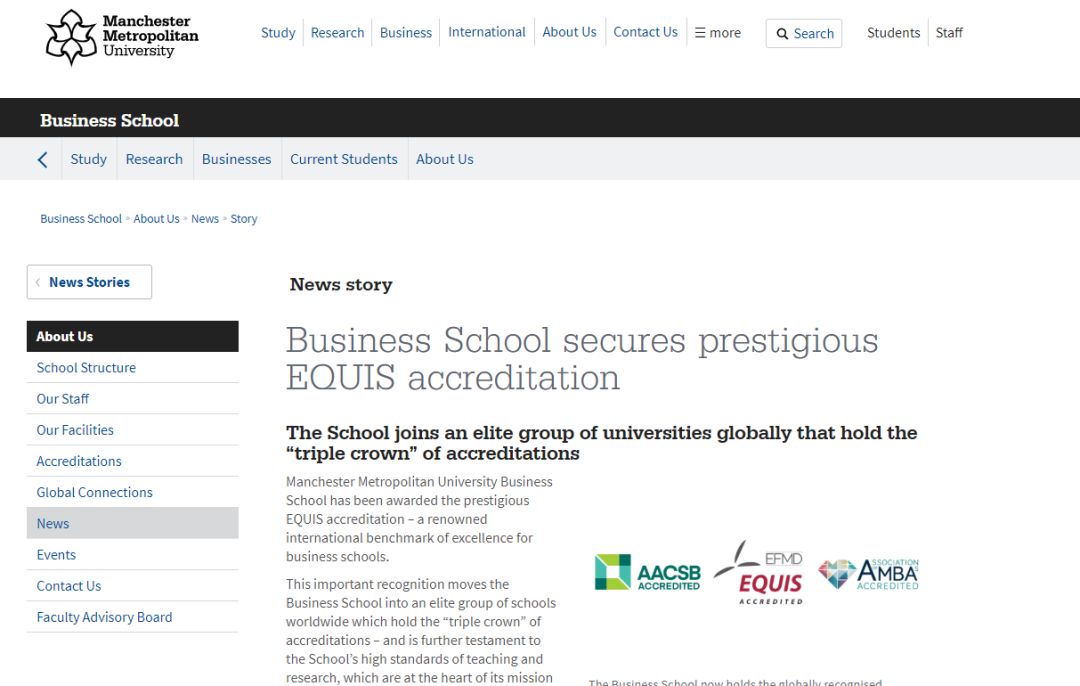 曼彻斯特城市大学新获取EQUIS认证,成为第22所同时获取三重认证的英国商学院。
