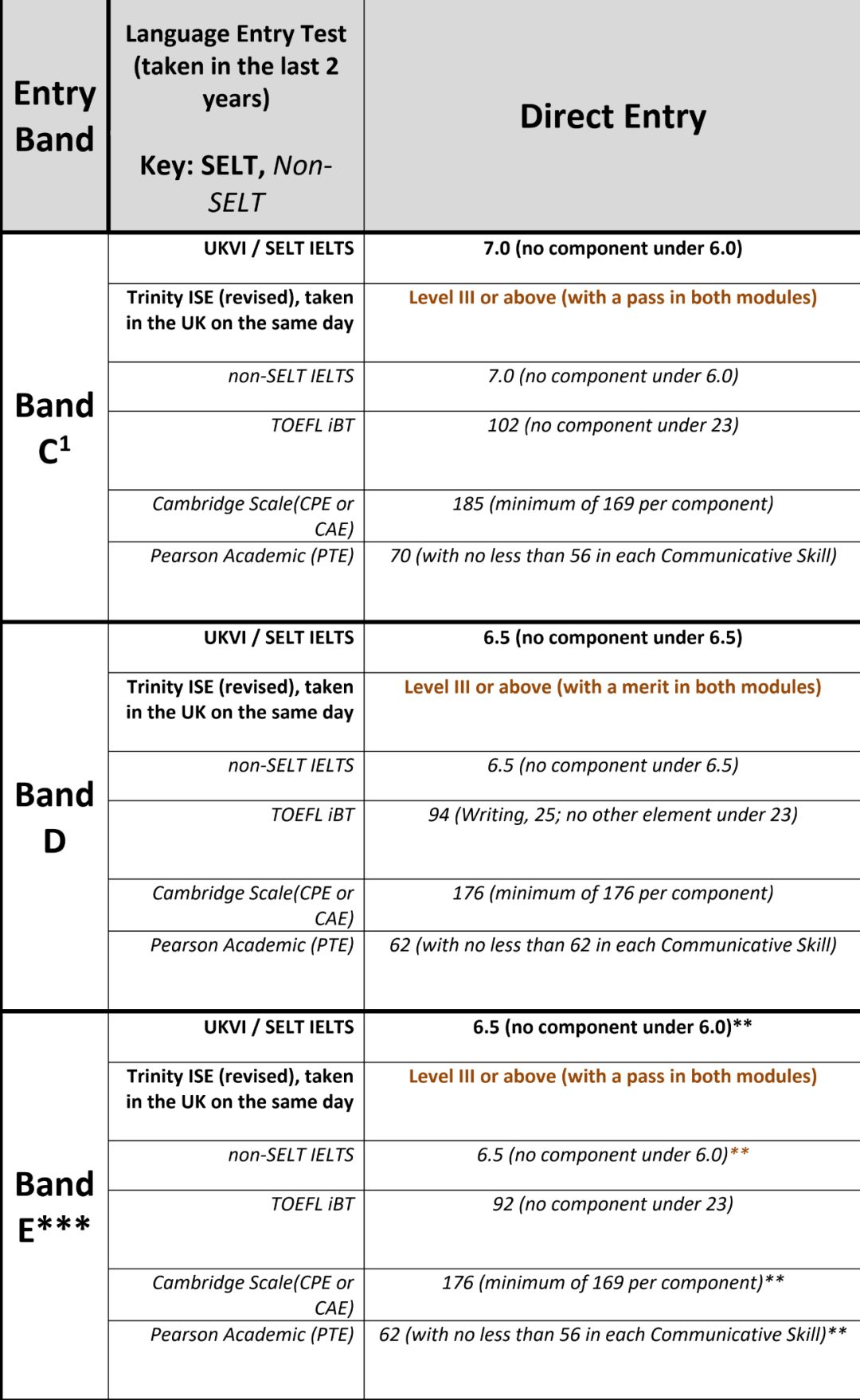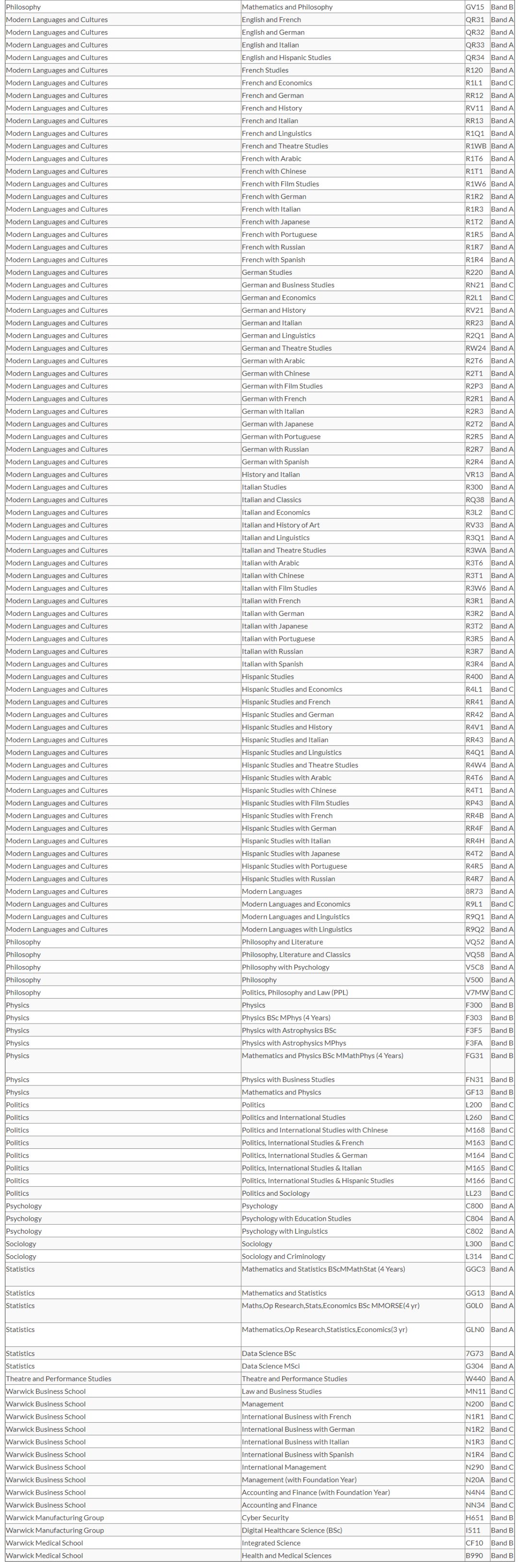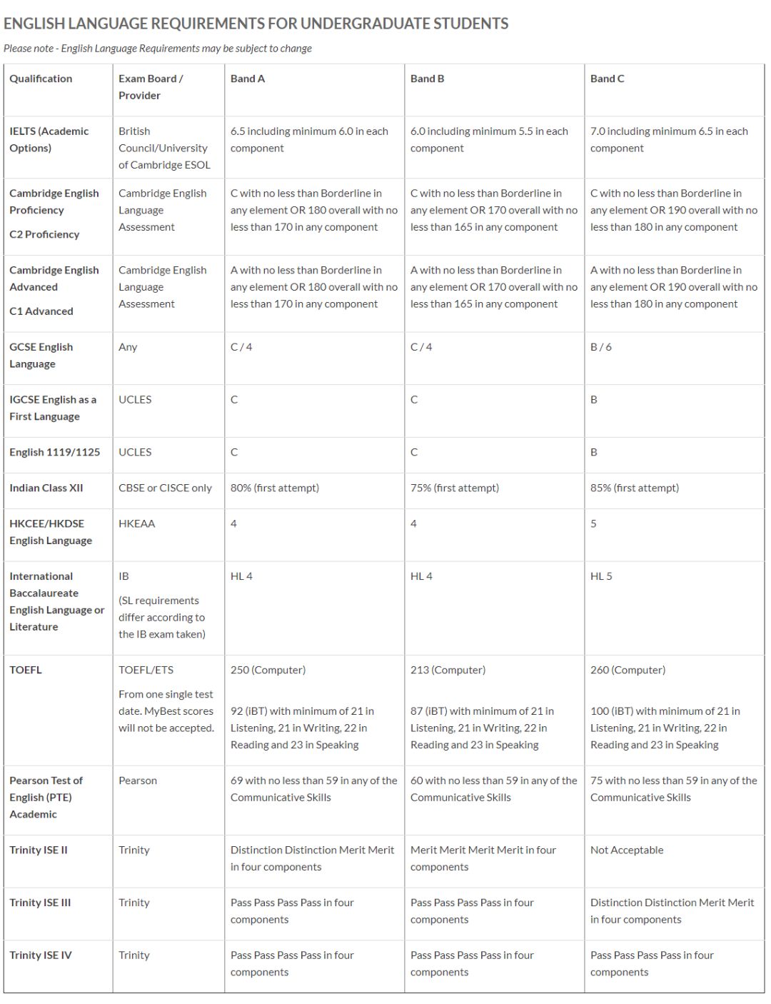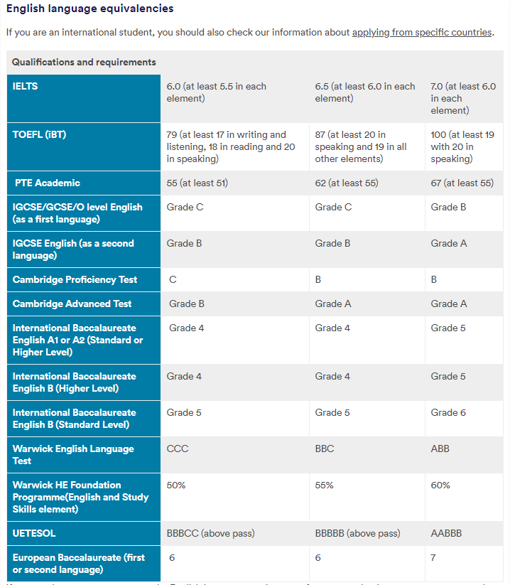 华威大学将语言要求分为Band A-C三个梯度,具体要求如下: