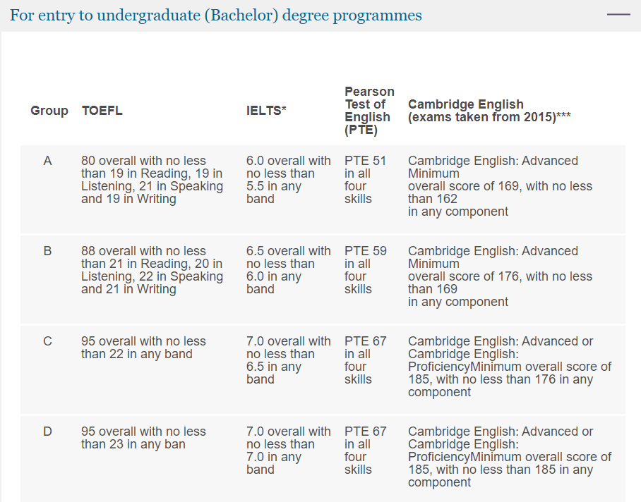 伯明翰大学语言要求分为GroupA-D四个梯度,具体不同梯度要求如下: