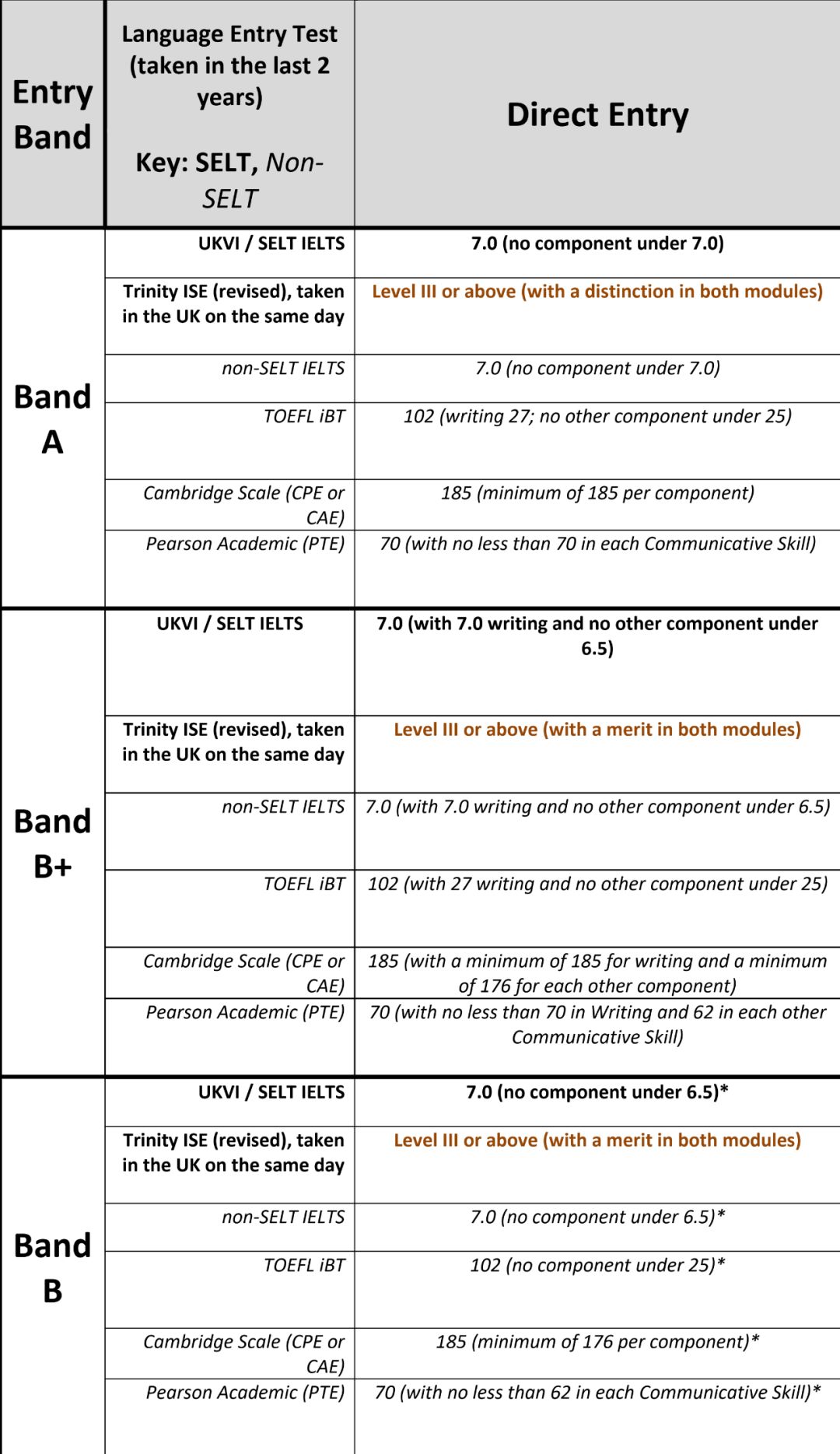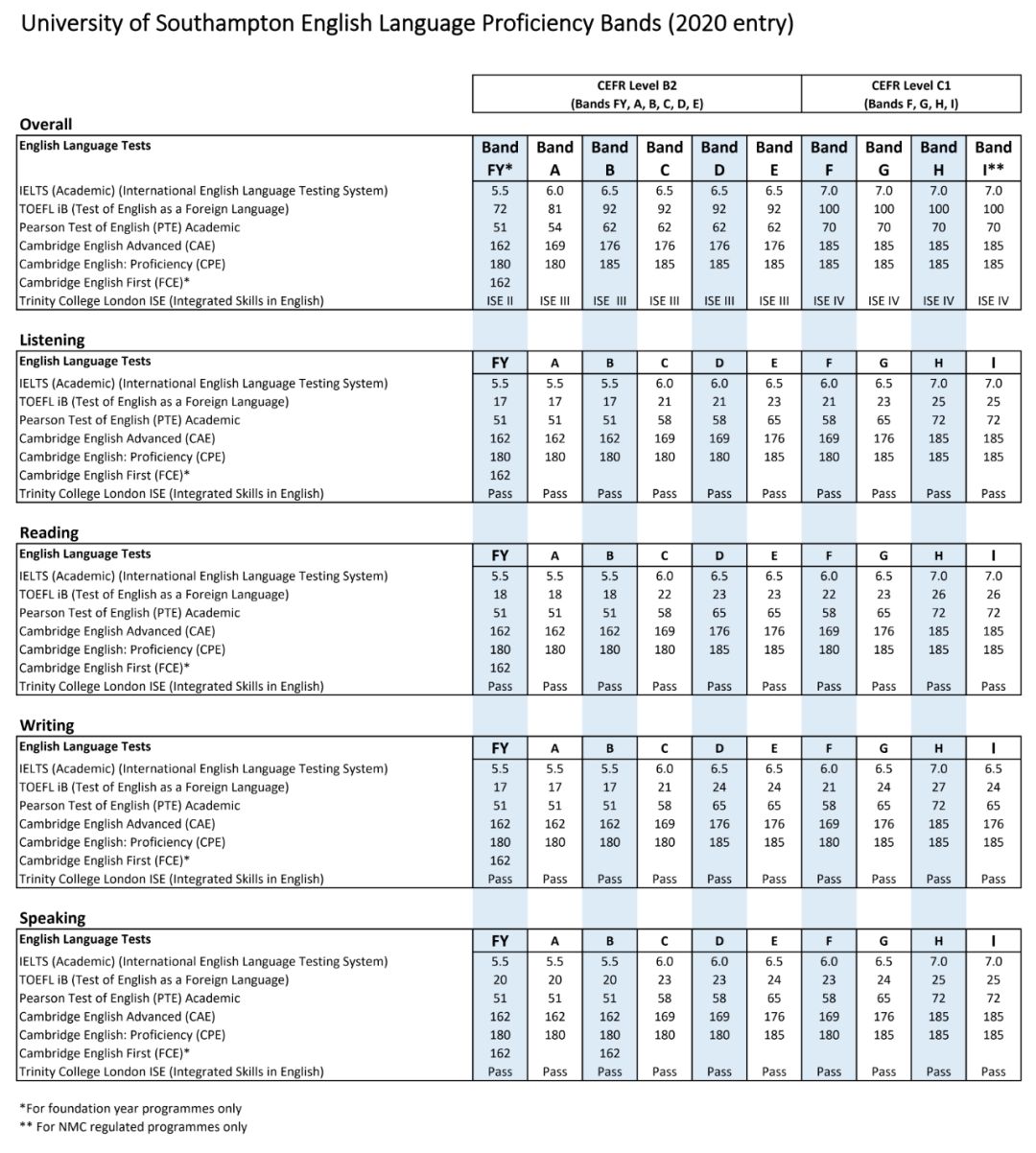 南安普顿大学将语言要求分为Band A-I 9个梯度,由于篇幅有限,小U仅为大家展示Band B的最低要求,其他请参考附上图片:
