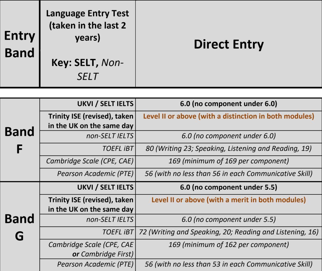 杜伦大学将语言要求分为Band A-G(包括B+)8个梯度,其中,针对本科学位课程的要求基本只涵盖Band B和Band E,以此为基准,具体要求如下: