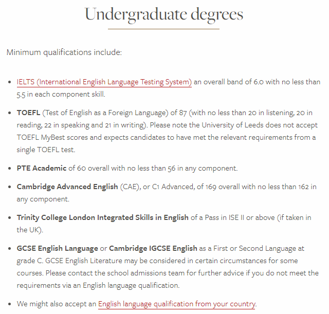 利兹大学不同课程的雅思要求也不同,利兹大学整理了大多数课程的语言最低要求: