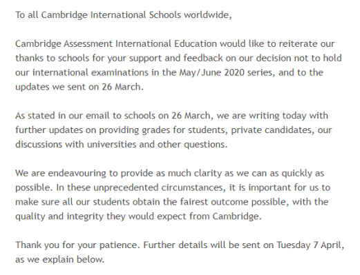 就在英国时间3月31日,CAIE考试局向全世界的合作学校发布了最新通知。