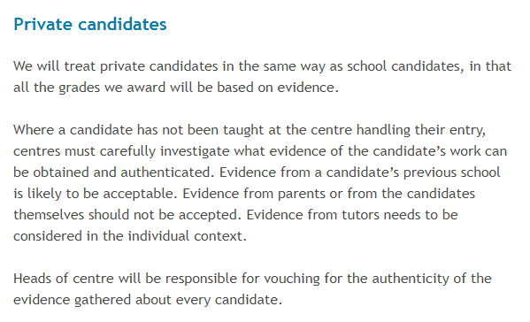 如果个人考生没有在中心接受教学,中心必须仔细对可获得和验证的考生信息进行调查。
