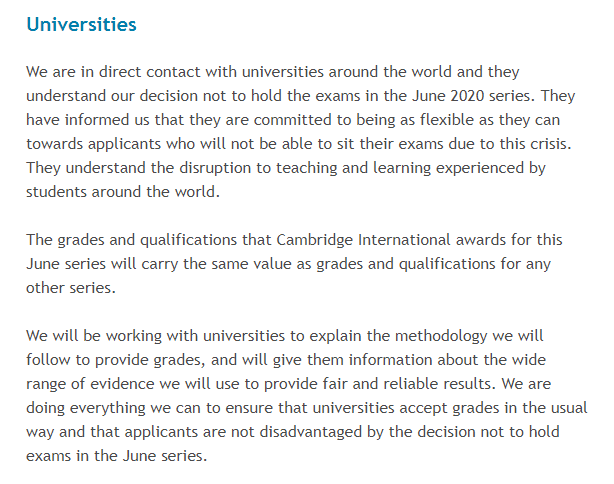 我们与世界各地的大学保持直接联系,各大学对我们决定不再举办今年的夏季大考表示理解。他们告诉我们,他们承诺对受影响不能参加考试的申请者采取尽可能灵活的录取政策。他们理解受疫情影响,世界各地考生的教学和学习都受到一定程度的干扰。