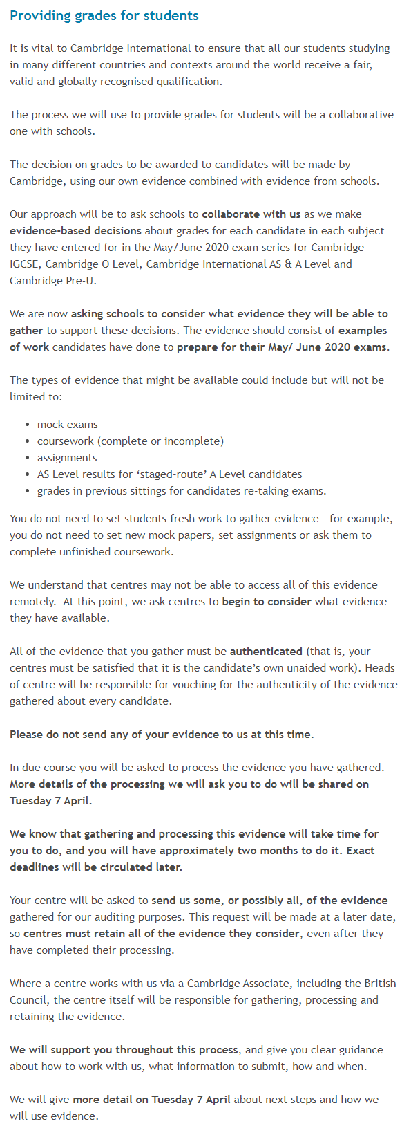 CAIE考试局将依据自己的审核依据(our own evidence),结合校方提供的信息(evidence from schools)来对考生进行评分。