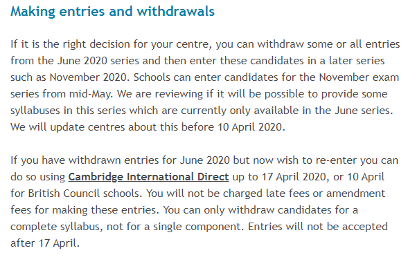 如果您之前已经取消了2020年6月的夏季大考,现在希望重新参加,可在2020年4月17日前重新报名(BC学校截止日期为4月10日)。您将不会被要求支付晚报名费或修改费用。