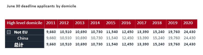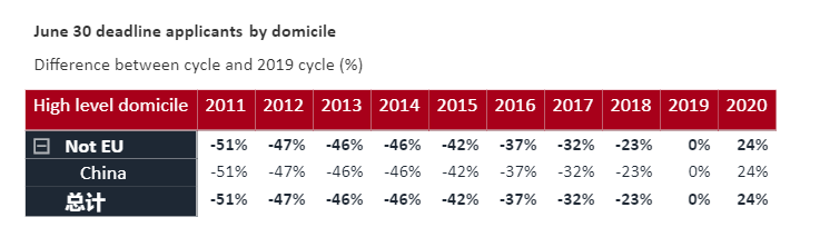 需要注意的是,因为UCAS此次发布的数据仅统计了6月30日截止前通过UCAS提交的申请,还有一些中国学生不走UCAS,直接向英国大学提交申请,这部分数据没有被统计进来。