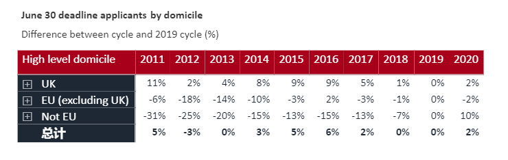 可以发现,除了欧盟地区的申请数据外,英国本土和海外(欧盟外)申请数据继续飙升,较之去年,分别提升了2%和10%。