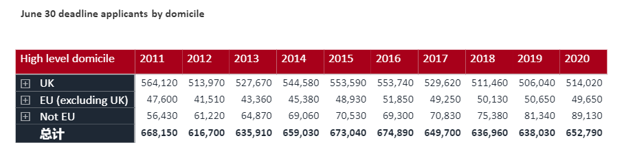 先来看看2020年6月deadline前本申请季英国UCAS申请递交的总数据: