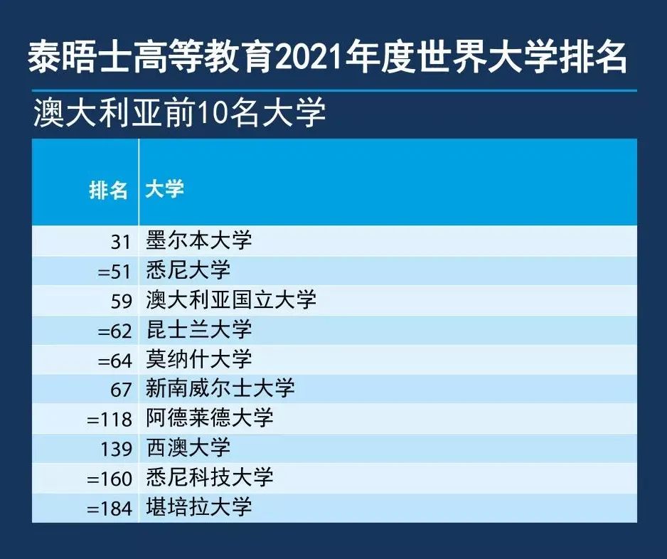 澳洲院校的总体情况有涨有降,八大中很多院校排名与去年持平,这里就不再多做赘述: