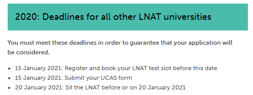 常规大学申请需在2021年1月15日前完成报名,在2021年1月20日前完成LANT考试。(牛剑则更早)