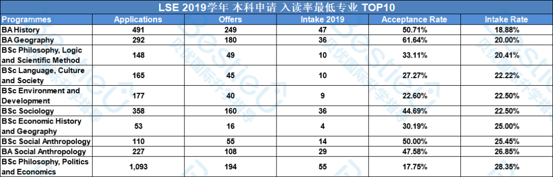 顺带一提,申请人数和录取发放数数据都相当强势的LLB专业,实际录取率也只有20.21%,排LSE录取率最低专业的TOP13。