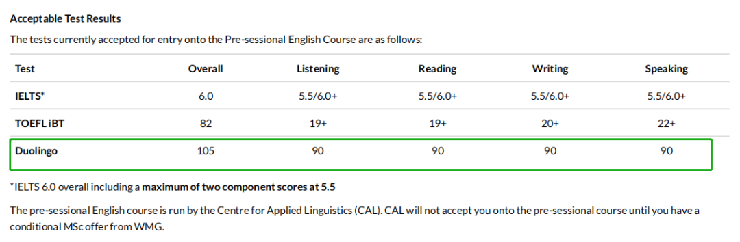 Warwick华威大学2021年入学正课语言课接受DET多邻国英语测试成绩,有小分要求,分数要求参考如下 图片(▲▼上下滑动可查看更多)
