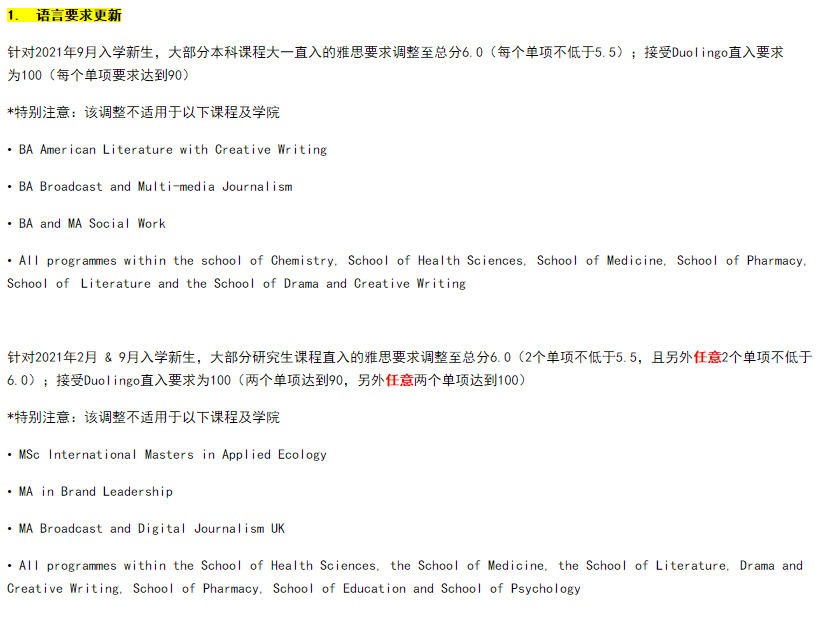 UEA英国东英吉利大学针对2021年9月入学新生,部分课程仍接受DET多邻国英语测试成绩(有小分要求),分数要求参考如下 图片