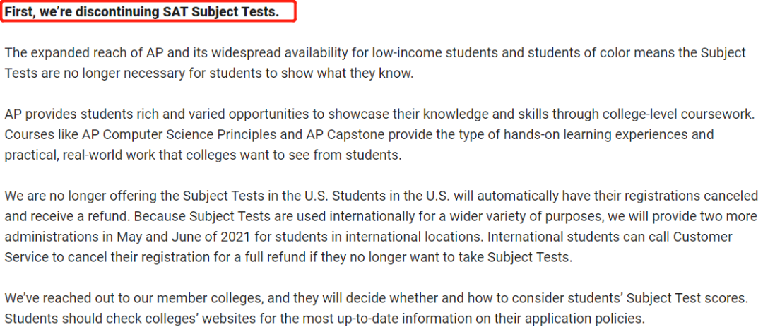 美国时间1月19日,College Board在宣布:取消SAT II (SAT Subject Test)以及SAT的写作部分。除了今年的最后两场考试,未来将不再提供。