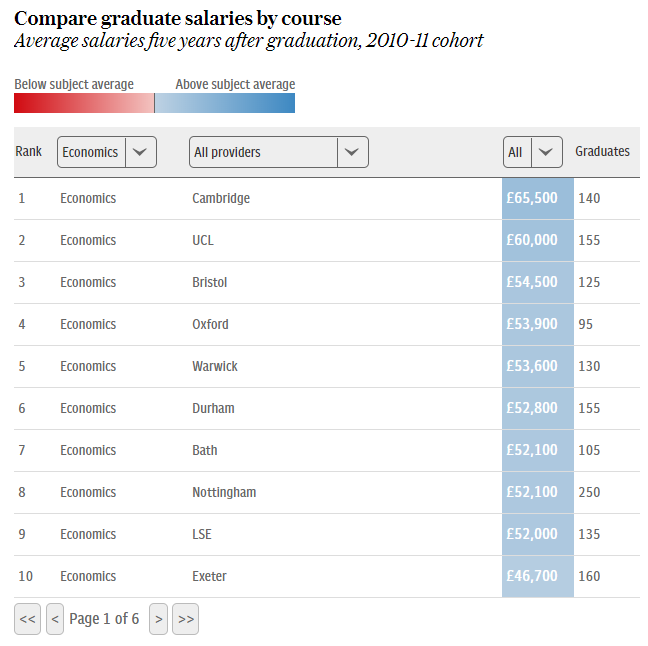 去年,每日电讯报根据英国教育部公布的最新数据,制作了一个索引工具,供大家检索特定院校/特定学科方向的2010-11学年毕业生在毕业五年后的就业薪资状况。