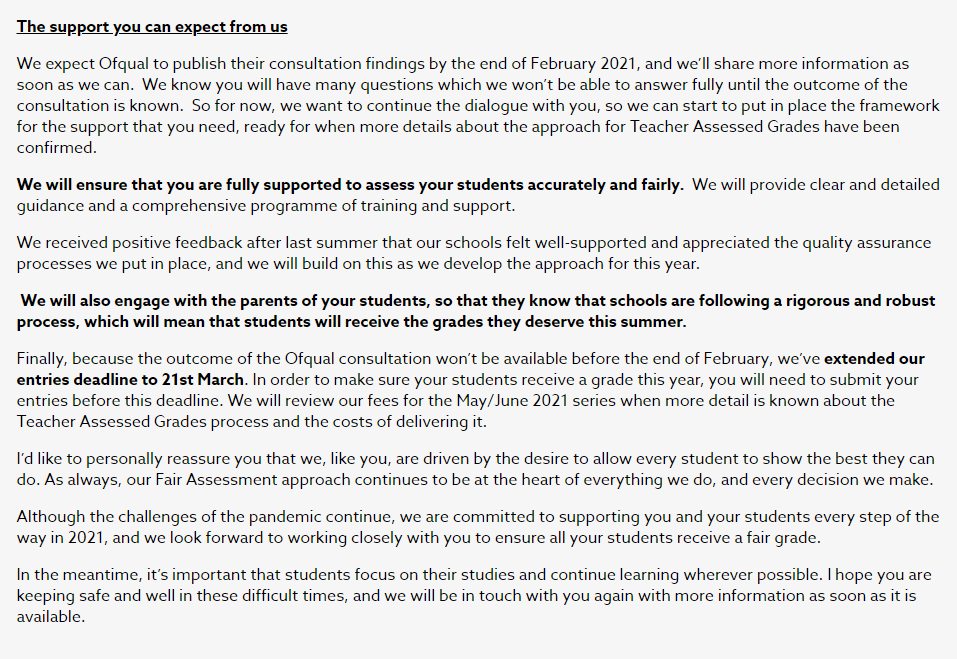 最后,由于Ofqual 讨论的结果要到2月底才会公布,我们已将报名截止日延长到了3月21日。为了确保您的学生在今年获得成绩,您需要在这个截止日前提交报名。当我们获得更多关于今夏教师评估分出分流程和涉及的传递开销后,我们将重新评估2021年5/6月考试的费用。