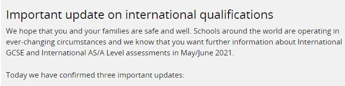 愿您和您的家人安康。世界各地的学校正在(因疫情影响而)瞬息万变的环境中步履维艰,我们也知道大家都希望获得有关2021年5月/6月IGCSE和AS/A-level国际大考的更多信息。