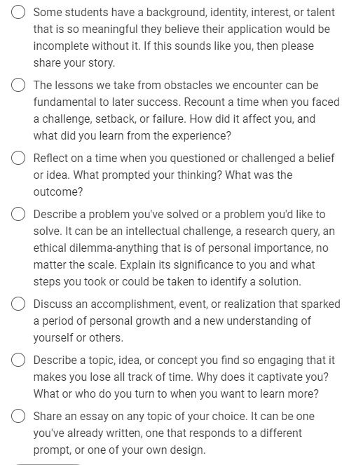 进行大学申请,通常会有几个文书主题指引(Essay Prompts)供你参考。