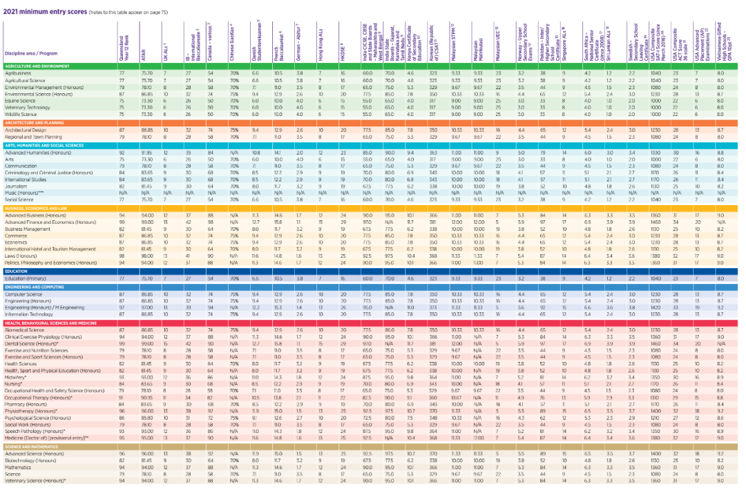 下图展示A-level项目显示的要求,同悉尼大学一样,不过有明显的备注:前者为3门学科成绩总和,后者为4门学科成绩总和。