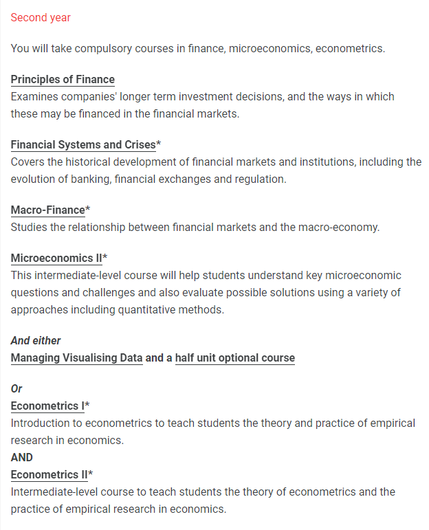 你将学习金融、微观经济学、计量经济学等必修课程。以及在秋季继续修习LSE100课程。