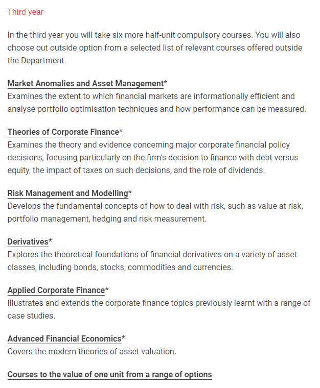 在LSE的第三学年,你将会再度修习6.5个学分的必修课程。你也可以从金融系外提供的相关课程名单中,选择相关选修课程进行修习。