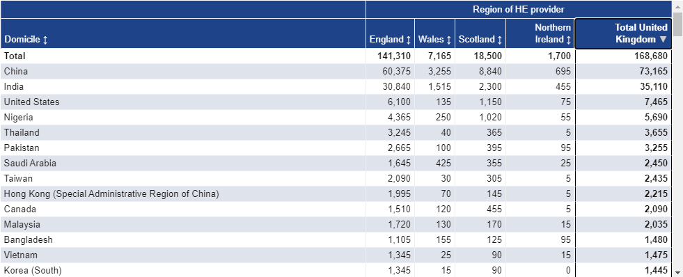回到本次的主题:仅以2019-20年全日制英本课程数据,哪些英国大学中国学生较多呢?