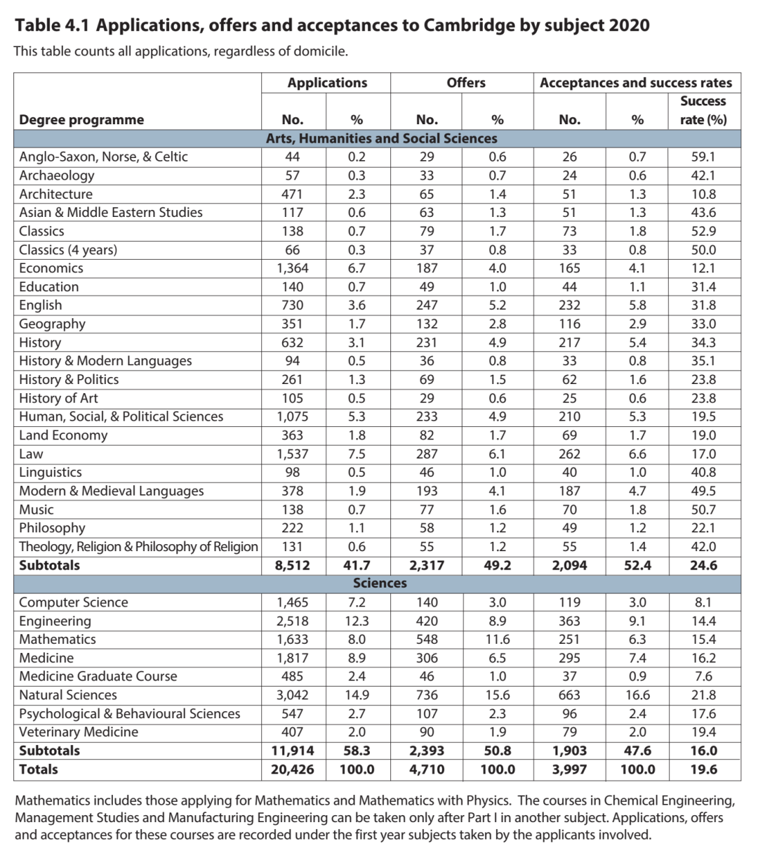由于不同专业开设申请人数和可提供席位不一,所以剑桥大学的数据统计中,各专业课程的录取情况是对自己申请课程竞争力的很好参考。