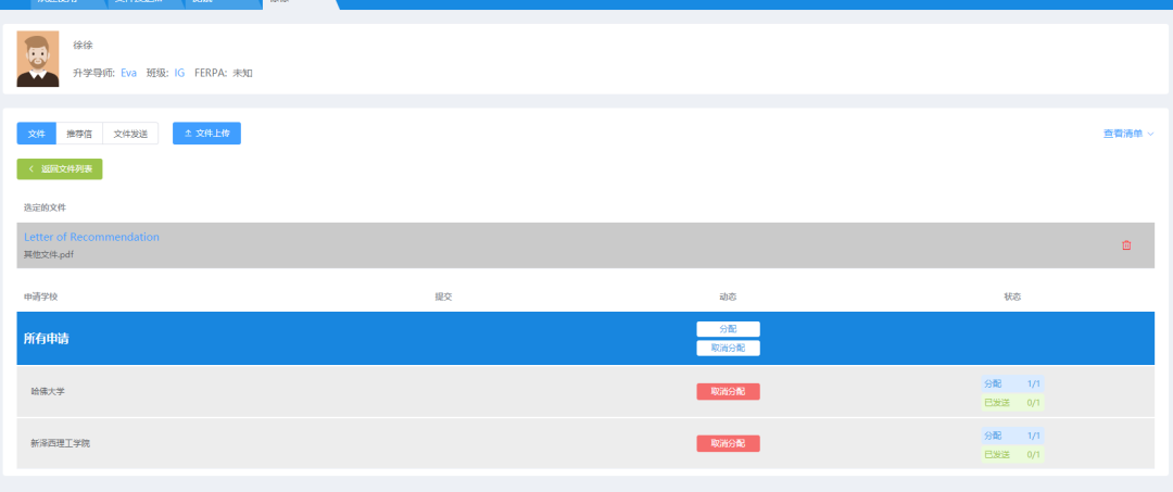 ⊙【文件发送】推荐信页,鼠标移至已上传的文件,点击可预览⊙【文件发送】文件发送页分配推荐信后查看推荐信页,显示推荐人/院校