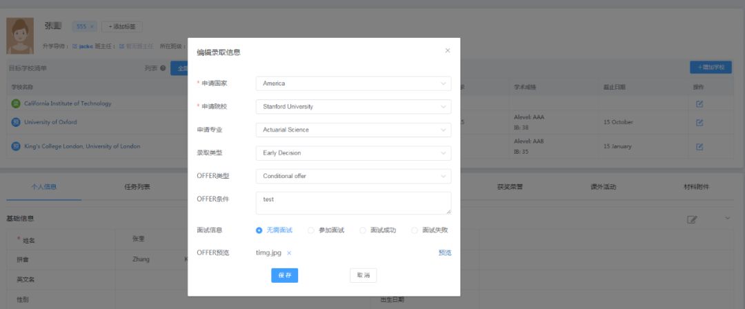 之前小编为各位老师介绍过,BestieU早前已与UCAS的Track系统打通,学生的UCAS申请的录取结果将自动统计显示。此次升级后,各位老师可以在学生升学档案中编辑英国以外大学详细的录取信息,其中包括录取类型、offer类型、offer条件、面试信息等。
