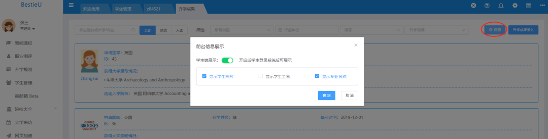 而教师端在本次更新后也上线了相关权限设置,广大升学老师可以根据自己的需求,设置学生端【升学成果】模块展示的信息。