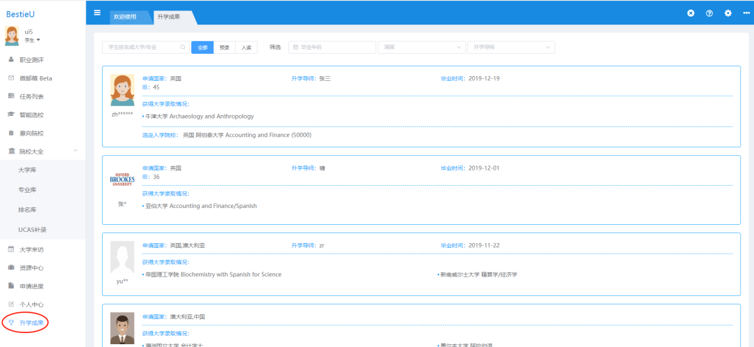 届时,学生可以通过该模块展示信息参考本校的学长学姐在往年的国际升学中的优异表现。