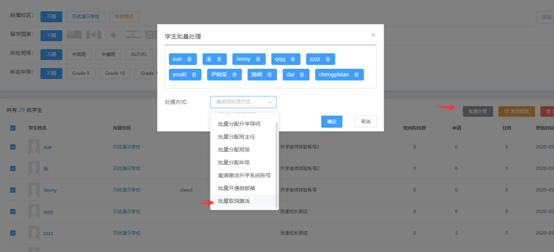 在学生管理批量处理功能模块中,我们新增了取消激活功能。