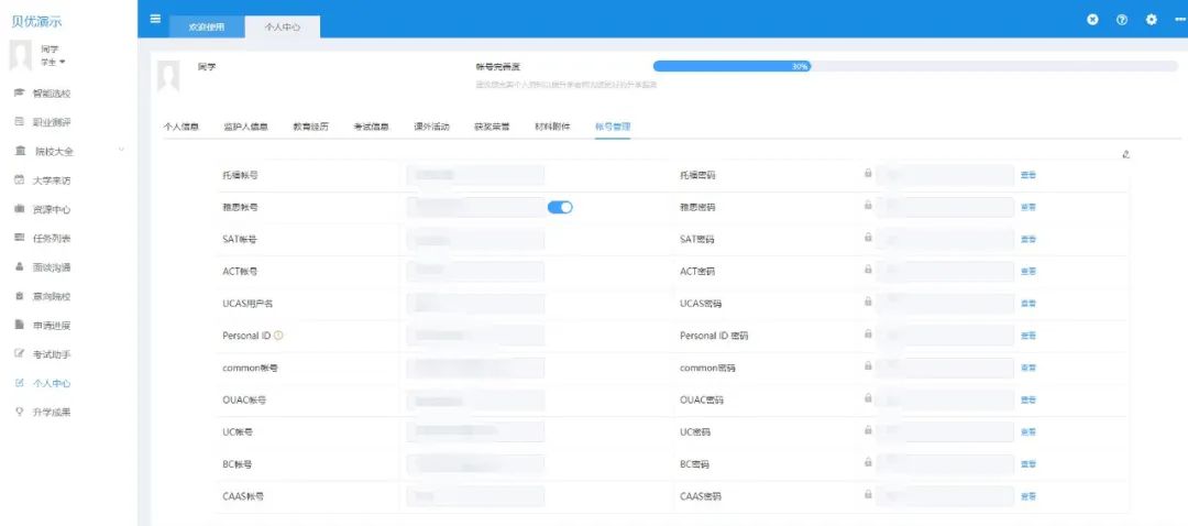 学生可以在该板块自行编辑补充教育经历信息和相关考试的账号信息。
