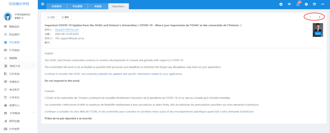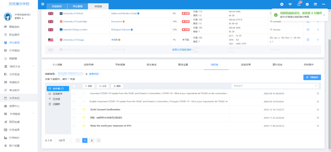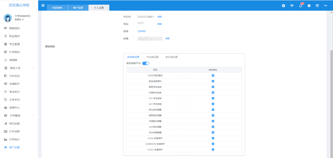 如果您有设置希望接收相关提醒,在指定学生的申请完成递交后,系统将通过微信消息通知该生申请完成递交信息,提醒内容包括:申请平台,申请递交院校,申请时间等信息。目前该功能支持英国UCAS,美国Common App,加拿大OUAC申请递交状态提醒。