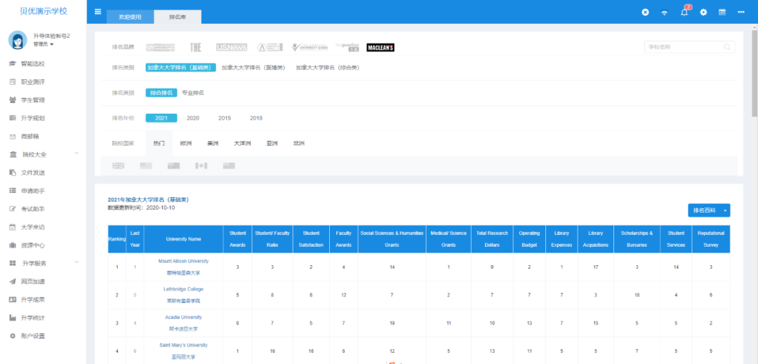2021版麦考林加拿大大学排名于上周进行更新,我们的系统也第一时间采集了最新版本排名的信息,并同步更新到了【院校大全】模块下的【排名库】中。