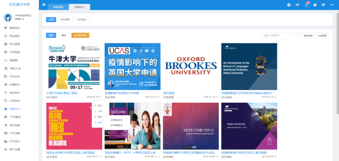 您可以选择【资源中心】模块中您希望分享的指定内容,点击分享按钮,分享给您希望分享的学生或家长。