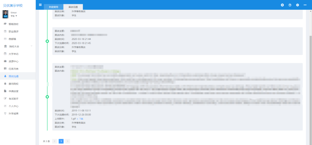 本次更新后,【学生端】增加了面谈沟通文档附件下载的支持。面谈沟通附件可以在【面谈沟通】版块中,找到指定的面谈沟通记录,在上传附件处点击右侧下载按钮即可完成附件下载。